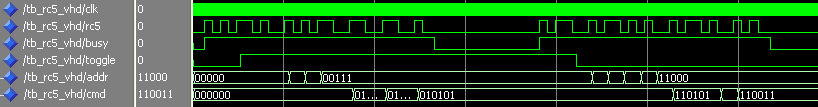 Mit Erkennen des Startbits wird das Signal busy aktiv. Nach der Übertragung wird busy wieder deaktiviert. Dieser Ablauf ist im Screenshot der Simulation schön zu sehen:
