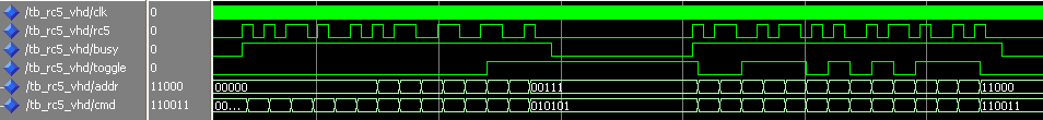 library IEEE; use IEEE.STD_LOGIC_1164.ALL; use IEEE.NUMERIC_STD.ALL; entity RC5_RX is Port ( clk : in STD_LOGIC; rc5 : in STD_LOGIC; busy : out STD_LOGIC; toggle : out STD_LOGIC; addr : out STD_LOGIC_VECTOR (4 downto 0); cmd : out STD_LOGIC_VECTOR (5 downto 0)); end RC5_RX; architecture Behavioral of RC5_RX is signal rc5sr : std_logic_vector (2 downto 0) := "000"; --constant oscclk : integer := 50000000; -- 50MHz z.B. FPGA constant oscclk : integer := 100000; -- 100kHz im CPLD constant bittime : integer := 1778; -- us constant clkdiv : integer := (oscclk/(1000000/bittime))-1; signal cnt : integer range 0 to clkdiv; signal bitcnt : integer range 0 to 15 := 15; signal bits : std_logic_vector (11 downto 0) := (others=>'0'); begin rc5sr <= rc5sr(1 downto 0) & rc5 when rising_edge(clk); process begin wait until rising_edge(clk); if (cnt<clkdiv) then cnt <= cnt+1; if (rc5sr(2) /= rc5sr(1)) then -- Flankenwechsel --> Resync if (cnt < clkdiv/2) then -- eine Abweichung bis +-20% wird korrekt ausgewertet: cnt <= clkdiv/4; -- weniger als halbe Bitdauer --> auf "viertel Bit" korrigieren else cnt <= 3*clkdiv/4; -- mehr als halbe Bitdauer --> auf "dreiviertel Bit" korrigieren end if; end if; else cnt <= 0; if (bitcnt<14) then -- 14 Bits eintakten, Startbits werden durchgeschoben bits <= bits(10 downto 0) & rc5sr(2); end if; if (bitcnt<15) then -- Übertragung aktiv bitcnt <= bitcnt+1; end if; end if; if (bitcnt=15) then -- Übertragung beendet busy <= '0'; if (rc5sr(2 downto 1) = "01") then -- Startbit erkannt --> cnt <= 3*clkdiv/4; -- nur 1/4 einer Bitzeit abwarten bitcnt <= 0; busy <= '1'; end if; end if; end process; toggle <= bits(11); addr <= bits(10 downto 6); cmd <= bits(5 downto 0); end Behavioral;